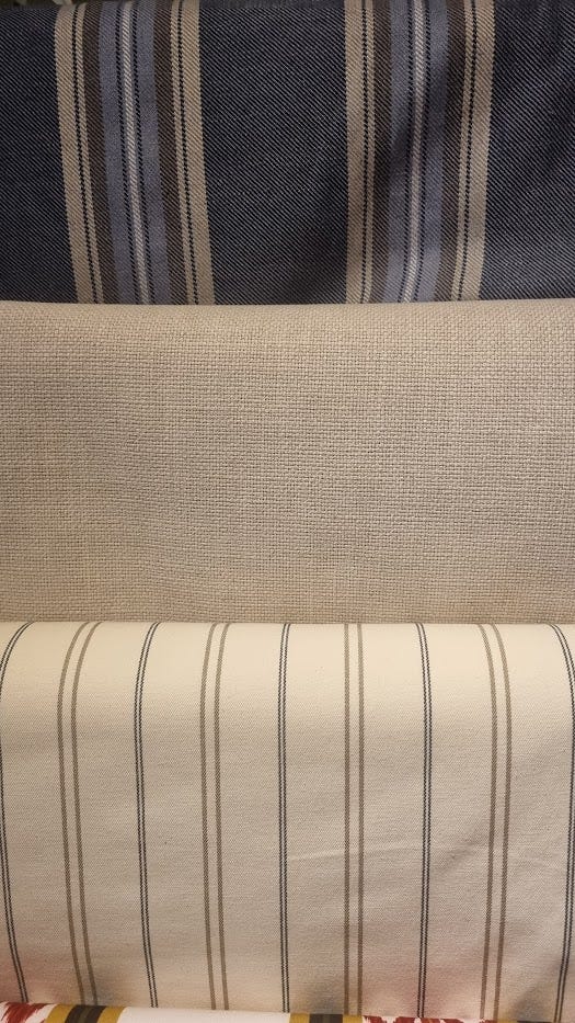 Na parte da sala, eu queria uma poltrona vintage, confortável e estampada e aí garimpando itens em um leilão, encontrei como eu queria! Aí escolhi um tecido listrado para forrar, com o fundo claro, dando vida ao contraste que planejei ali (com o armário da copa).