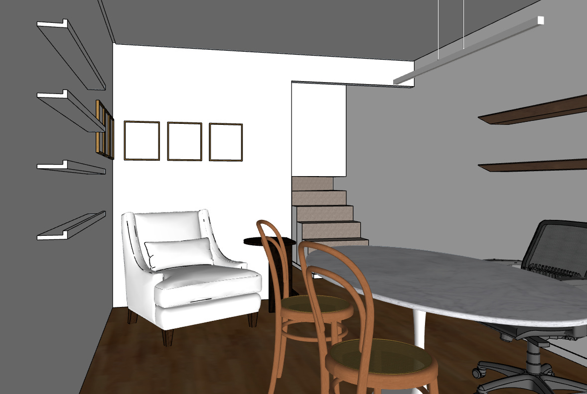 Definido o conceito e layout da planta, que é a disposição dos móveis, considerando formato, tamanho e circulação, parti para a criação, ou seja, desenho das marcenarias planejadas, marmoraria e escolha de mobiliários.