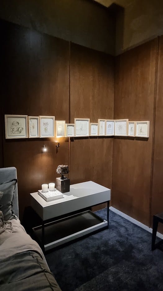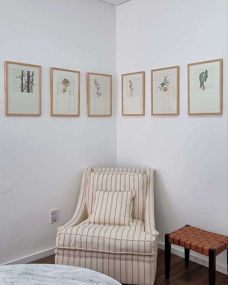 Atrás da poltrona, eu queria quadrinhos com alguma arte quadrada em moldura maior, usando passe-partout grande, retangular. Dispostos em L. Havia visto um ambiente na Casa Cor de Brasília com quadros virando a quina na parede, era um quarto e eu amei. Só não sabia qual arte. Eis que um dia eu vejo no Instagram da Volar Interiores, da Érika Gonçalves, um story mostrando uns quadrinhos de aquarela pintado pelo João Victor, que trabalha lá e já fez alguns freelances para mim, um menino muito querido. Não pensei 2x, chamei o João para criar as artes. Mostrei o projeto e o deixei livre para criar! Amei demais e fico babando neles todos os dias.