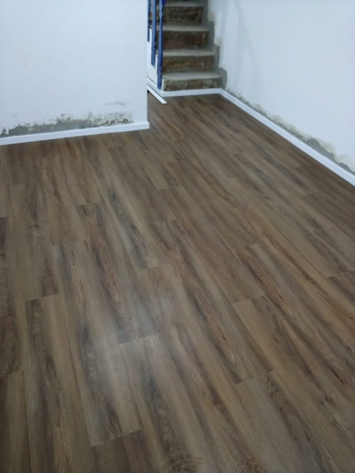 A primeira coisa que escolhi, foi o piso. Um vinílico amadeirado num tom médio escuro. Escolhi um que gosto, que não tem muito brilho quando bate a luz (porque vinil brilha), sem veio muito profundos, prefiro os de textura mais lisa.